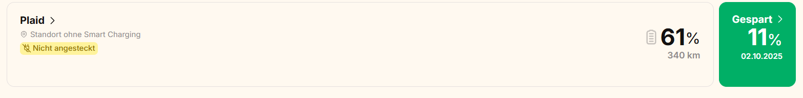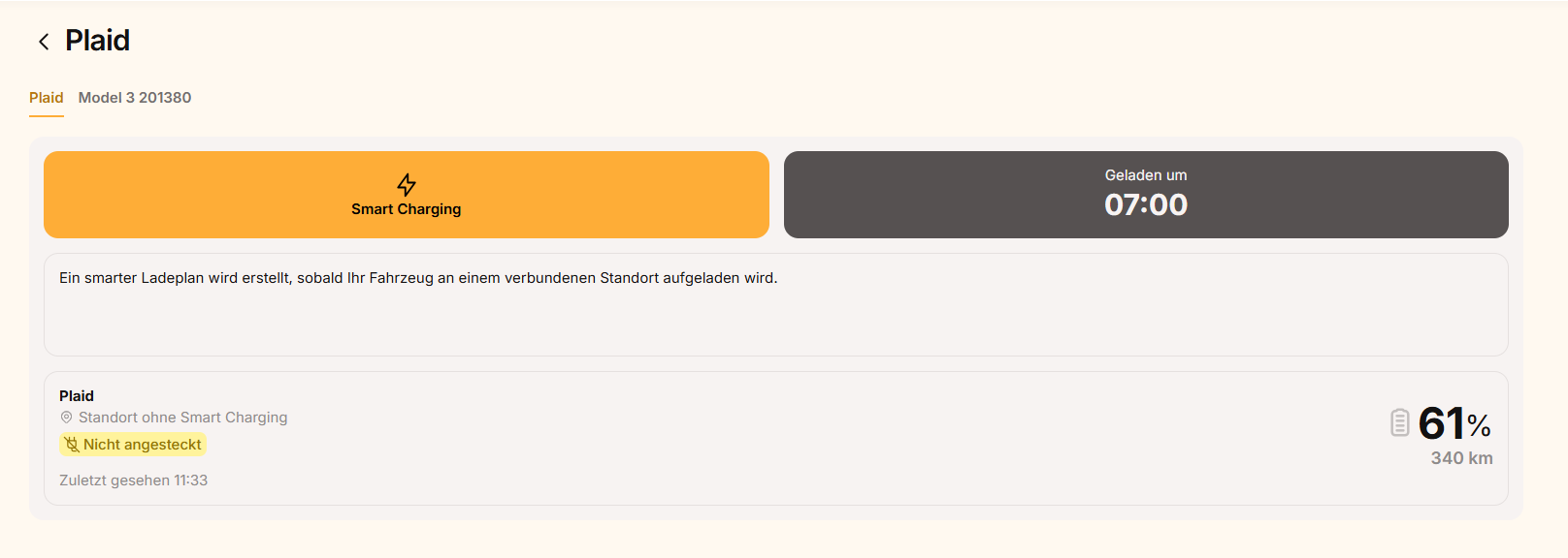 Klicke auf den Modellname - in diesem Fall "Plaid" um zur Smart Charging Einstellung zu kommen oder auf das grüne Feld für eine Statistik Deiner Ladevorgänge.
